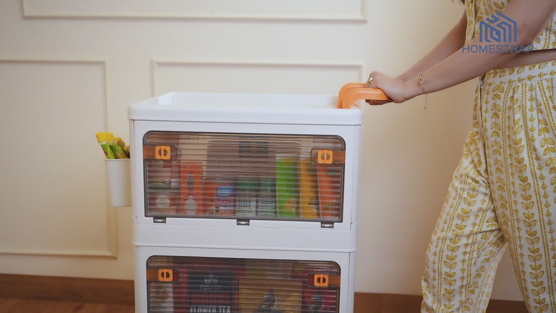 Homestrap Rolling Utility: your ultimate versatile storage companion, crafted for ease and adaptability. This collapsible cabinet on wheels offers large storage space and sturdy construction for multi-use functionality, making it perfect for any room. With anti-slip lock-equipped wheels, an odor-proof design, and a convenient handle, it ensures stability, freshness, and ease of use. From kitchen to office or garage essentials, this spacious and sturdy cabinet caters to diverse storage needs, redefining convenience in the organization.